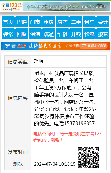 褚家庄村食品厂现招长期质检化验员一名,车间工一名(年工资5万保底),会电脑手绘的设计人员一名,直播中控一名,网店运营一名。薪资:面谈。要求:年龄25-55周岁身体健康有工作经验的优先。电话15373196357