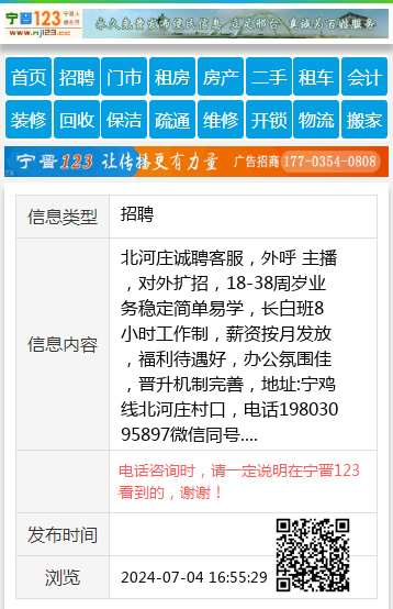 北河庄诚聘客服,外呼 主播,对外扩招,18-38周岁业务稳定简单易学,长白班8小时工作制,薪资按月发放,福利待遇好,办公氛围佳,晋升机制完善,地址:宁鸡线北河庄村口,电话19803095897微信同号. 【电话咨询时,请一定说明在宁晋123看到的,谢谢!】 |