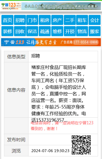 褚家庄村食品厂现招长期库管一名,化验质检员一名,车间工两名(年工资5万保底),会电脑手绘的设计人员一名,直播中控一名,网店运营一名。薪资:面谈。要求:年龄25-55周岁身体健康有工作经验的优先。电话15373196357 【电话咨询时,请一定说明在宁晋123看到的,谢谢!】 |
