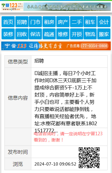 ✅诚招主播,每日7个小时工作时间✅休三天✅底薪三千加提成综合薪资5千-1万上不封顶,内容简单好上手,新手小白也可,主要看个人努力只要敢说话都能挣到钱,有直播相关经验者优先, 地址:水榭花都有意者联系18021517772 【电话咨询时,请一定说明在宁晋123看到的,谢谢!】 |