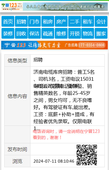 济南电缆库房招聘:普工5名、司机3名,工资电议15031941667仅限电话联系。