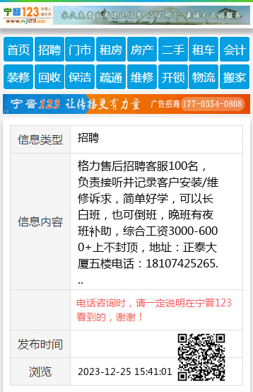 格力售后招聘客服100名,负责接听并记录客户安装/维修诉求,简单好学,可以长白班,也可倒班,晚班有夜班补助,综合工资3000-6000+上不封顶,地址:正泰大厦五楼电话:18107425265 【电话咨询时,请一定说明在宁晋123看到的,谢谢!】 |