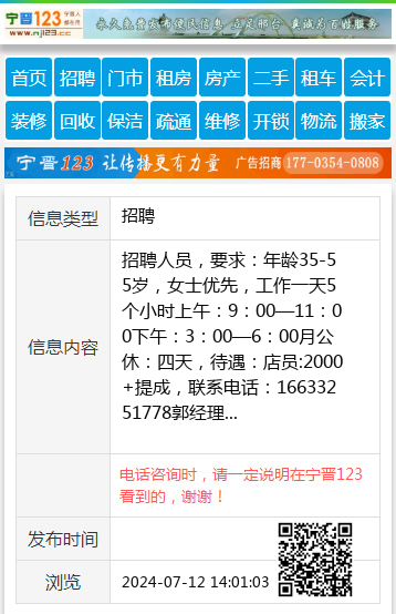 招聘人员,要求:年龄35-55岁,女士优先,工作一天5个小时上午:9:00—11:00下午:3:00—6:00月公休:四天,待遇:店员:2000+提成,联系电话:16633251778郭经理 【电话咨询时,请一定说明在宁晋123看到的,谢谢!】 |