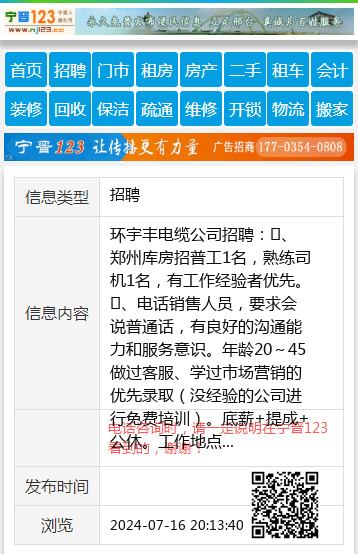 环宇丰电缆公司招聘:❶、郑州库房招普工1名,熟练司机1名,有工作经验者优先。❷、电话销售人员,要求会说普通话,有良好的沟通能力和服务意识。年龄20~45做过客服、学过市场营销的优先录取(没经验的公司进行免费培训)。底薪+提成+公休。工作地点:天一广场附近,联系电话 13131939710 【电话咨询时,请一定说明在宁晋123看到的,谢谢!】 |