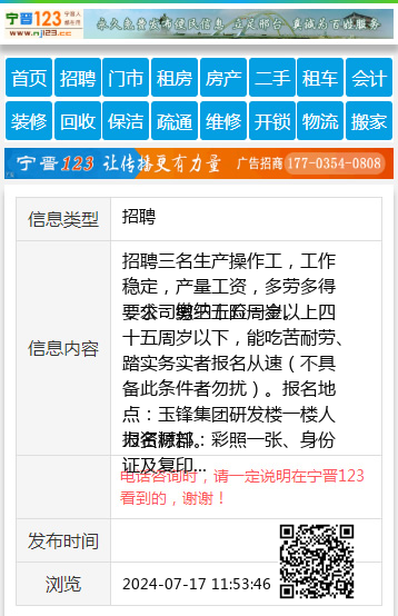 招聘三名生产操作工,工作稳定,产量工资,多劳多得,公司缴纳五险一金。
