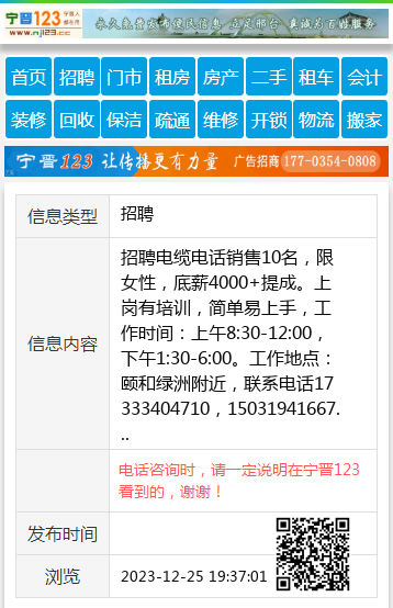 招聘电缆电话销售10名,限女性,底薪4000+提成。上岗有培训,简单易上手,工作时间:上午8:30-12:00,下午1:30-6:00。工作地点:颐和绿洲附近,联系电话17333404710,15031941667 【电话咨询时,请一定说明在宁晋123看到的,谢谢!】 |