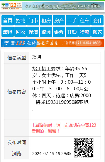 招工招工要求:年龄35-55岁,女士优先,工作一天5个小时上午:9:00—11:00下午:3:00—6:00月公休:四天,待遇:店员:2000+提成19931196950郭亚旭 【电话咨询时,请一定说明在宁晋123看到的,谢谢!】 |