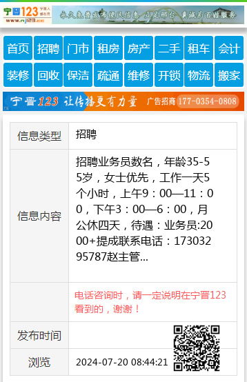 招聘业务员数名,年龄35-55岁,女士优先,工作一天5个小时,上午9:00—11:00,下午3:00—6:00,月公休四天,待遇:业务员:2000+提成联系电话:17303295787赵主管 【电话咨询时,请一定说明在宁晋123看到的,谢谢!】 |