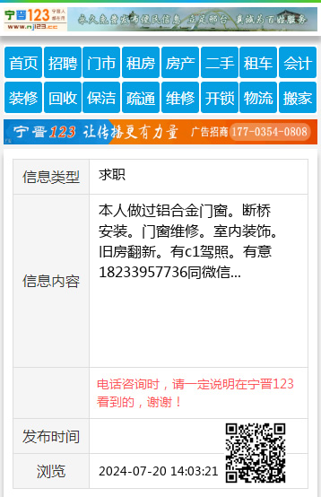 本人做过铝合金门窗。断桥安装。门窗维修。室内装饰。旧房翻新。有c1驾照。有意18233957736同微信 【电话咨询时,请一定说明在宁晋123看到的,谢谢!】 |