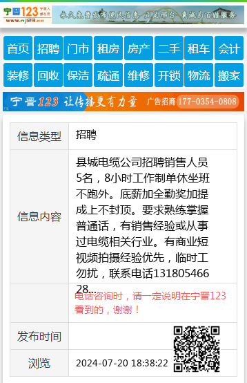 县城电缆公司招聘销售人员5名,8小时工作制单休坐班不跑外。底薪加全勤奖加提成上不封顶。要求熟练掌握普通话,有销售经验或从事过电缆相关行业。有商业短视频拍摄经验优先,临时工勿扰,联系电话13180546628 【电话咨询时,请一定说明在宁晋123看到的,谢谢!】 |