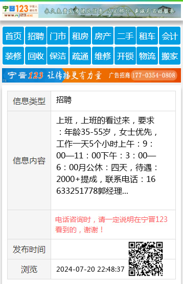 上班,上班的看过来,要求:年龄35-55岁,女士优先,工作一天5个小时上午:9:00—11:00下午:3:00—6:00月公休:四天,待遇:2000+提成,联系电话:16633251778郭经理 【电话咨询时,请一定说明在宁晋123看到的,谢谢!】 |