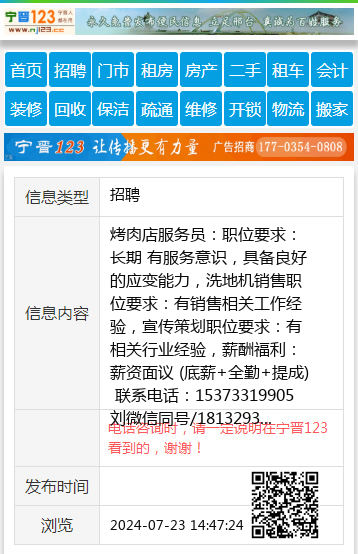 烤肉店服务员:职位要求:长期 有服务意识,具备良好的应变能力,洗地机销售职位要求:有销售相关工作经验,宣传策划职位要求:有相关行业经验, 薪酬福利:薪资面议 (底薪+全勤+提成) 联系电话:15373319905 刘微信同号/18132930964 王(烤肉)