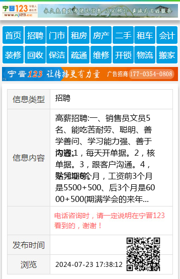 高薪招聘:一、销售员文员5名、能吃苦耐劳、聪明、善学善问、学习能力强、善于沟通。