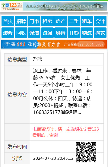 没工作,看过来,要求:年龄35-55岁,女士优先,工作一天5个小时上午:9:00—11:00下午:3:00—6:00月公休:四天,待遇:店员:2000+提成,联系电话:16633251778郭经理 【电话咨询时,请一定说明在宁晋123看到的,谢谢!】 |