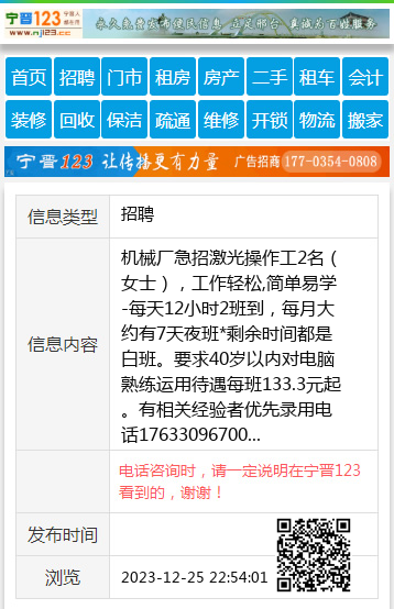 机械厂急招激光操作工2名(女士),工作轻松,简单易学-每天12小时2班到,每月大约有7天夜班*剩余时间都是白班。要求40岁以内对电脑熟练运用待遇每班133.3元起。有相关经验者优先录用电话17633096700 【电话咨询时,请一定说明在宁晋123看到的,谢谢!】 |