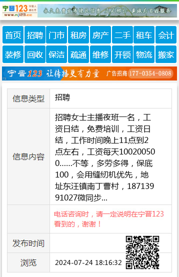 招聘女士主播夜班一名,工资日结,免费培训,工资日结,工作时间晚上11点到2点左右,工资每天100200500……不等,多劳多得,保底100,会用缝纫机优先,地址东汪镇南丁曹村,18713991027微同步