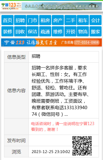 招聘一名拼多多客服,要求长期工、性别:女。有工作经验优先,工作环境干净、舒适、轻松、管吃住。还有团建、旅游活动。主要有早、晚班需要倒班,工资面议,有意者联系电话13313394074(微信同号) 【电话咨询时,请一定说明在宁晋123看到的,谢谢!】 |