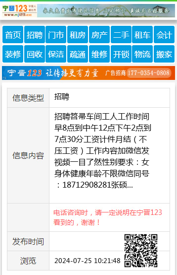 招聘笤帚车间工人工作时间早8点到中午12点下午2点到7点30分工资计件月结(不压工资)工作内容加微信发视频一目了然性别要求:女身体健康年龄不限微信同号:18712908281张硕 【电话咨询时,请一定说明在宁晋123看到的,谢谢!】 |