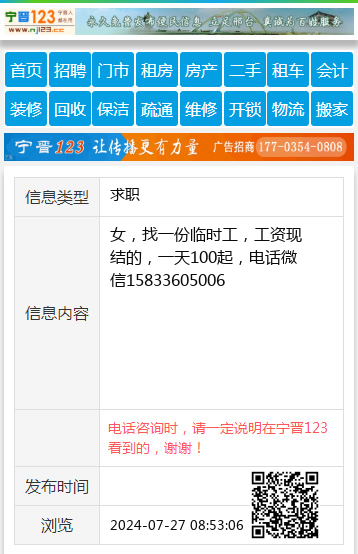 女,找一份临时工,工资现结的,一天100起,电话微信15833605006
