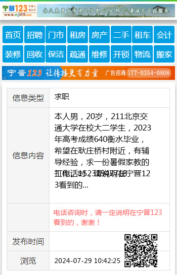 本人男,20岁,211北京交通大学在校大二学生,2023年高考成绩640衡水毕业,希望在耿庄桥村附近,有辅导经验,求一份暑假家教的工作。15231947718