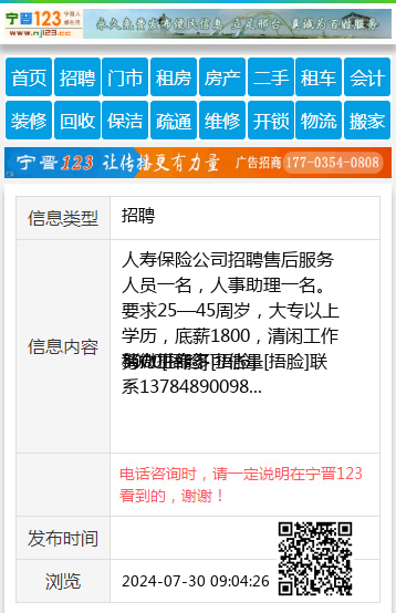 人寿保险公司招聘售后服务人员一名,人事助理一名。要求25—45周岁,大专以上学历,底薪1800,清闲工作3000[捂脸]