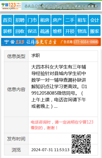 大四本科女大学生有三年辅导经验针对县城内学生初中数学一对一辅导查漏补缺讲解知识点让学习更高效。☎19912058085微信同号。(上午上课,电话咨询请下午或者晚上) 【电话咨询时,请一定说明在宁晋123看到的,谢谢!】 |