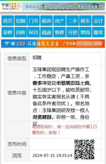 要求:男三十五周岁以上四十五周岁以下,能吃苦耐劳、踏实务实者报名从速(不具备此条件者勿扰)。报名地点:玉锋集团研发楼一楼人力资源部。