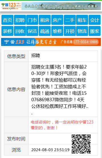 招聘女主播3名!要求年龄20-30岁!形象好气质佳,会穿搭!有无经验都可以有经验者优先!工资加提成上不封顶!能接受夜班!电话15076869837微信同步!4天公休轻松氛围好工作环境好