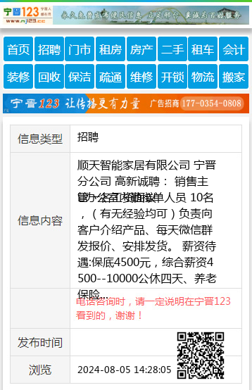 顺天智能家居有限公司 宁晋分公司 高新诚聘: 销售主管一名工资面议 ❶办公室内勤接单人员 10名,(有无经验均可)负责向客户介绍产品、每天微信群发报价、安排发货。 薪资待遇:保底4500元,综合薪资4500--10000公休四天、养老保险、团建和各项奖励等。 工作时间:8:30-12:00 2:00--6:30 ❷售后客服5名,女士优先,25到45岁,薪资3500--6000 元, 月公休4天,入养老保险, 工作时间:8:30-12:00 2:00-6:30 ❸电话客服(无销售性质),每天工作6小时,时间自由,月休4天,薪资3000--5000 🏠地址1:西环路韩沐汗蒸对过 🏠 地址2:童泰大楼红绿灯南行300米路西 ☎️联系:韩经理17692672326(微信同号) |