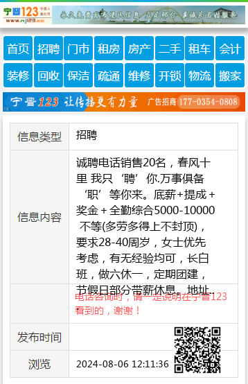 诚聘电话销售20名,春风十里 我只‘聘’你.万事俱备‘职’等你来。底薪+提成+奖金+全勤综合5000-10000 不等(多劳多得上不封顶),要求28-40周岁,女士优先考虑,有无经验均可,长白班,做六休一,定期团建,节假日部分带薪休息。地址:老车站正泰大厦,联系电话:15612978963 【电话咨询时,请一定说明在宁晋123看到的,谢谢!】 |
