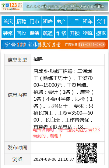 唐邱乡机械厂招聘:二保焊工(熟练工男士),工资7000--15000元,工资月结。招聘:会计(1名),库管(1名)不会可学徒,质检(1名)。只招女士, 要求:只招长期工,工资=3500—6000, 长白班,工作待遇优,有意者可联系电话:18714284394。