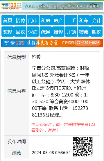 宁晋分公司.高薪诚聘:财税顾问1名.外账会计3名(一年以上经验).学历:大学.双休➕法定节假日➕无险.上班时间:早:8:30-12:00 晚:1:30-5:30.综合薪资4000-10000不等. 联系电话:15227381136谷经理 【电话咨询时,请一定说明在宁晋123看到的,谢谢!】 |