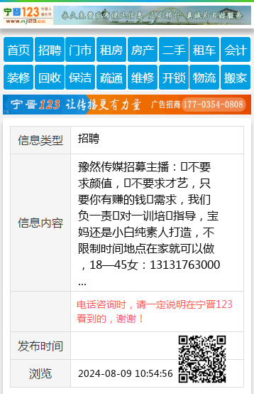 豫然传媒招募主播:不要求颜值,不要求才艺,只要你有赚的钱需求,我们负一责对一训培指导,宝妈还是小白纯素人打造,不限制时间地点在家就可以做,18—45女:13131763000 【电话咨询时,请一定说明在宁晋123看到的,谢谢!】 |