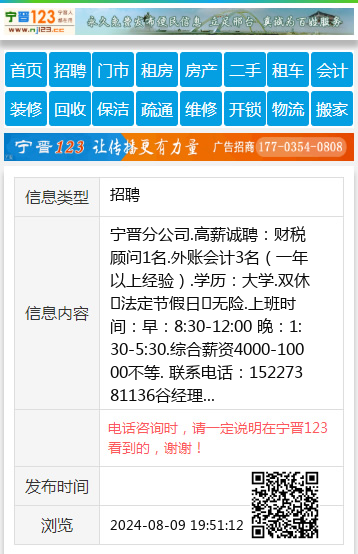 宁晋分公司.高薪诚聘:财税顾问1名.外账会计3名(一年以上经验).学历:大学.双休➕法定节假日➕无险.上班时间:早:8:30-12:00 晚:1:30-5:30.综合薪资4000-10000不等. 联系电话:15227381136谷经理 【电话咨询时,请一定说明在宁晋123看到的,谢谢!】 |