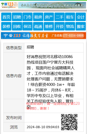 好消息祝贺河北移动10086热线项目落户宁晋方大科技园, 现面向社会诚聘精英人才,工作内容通过电话解决处理客户问题,无营销要求!综合薪资4000-1w+ 年龄18~35周岁,月休6~8天,学历中专及以上毕业,有相关工作经验优先入职,晋升空间巨大!13831935896微信同号 【电话咨询时,请一定说明在宁晋123谢谢!】 |
