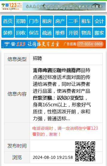 | 防骗提醒: | 宁晋123(www.nj123.cc)提醒您:手工活、网络兼职、刷单,都是骗子!凡以各种名义收取费用的都是骗子!找工作是往兜里挣钱,让你往外掏钱的都是骗子!异地招聘请提高警惕,谨防诈骗! |