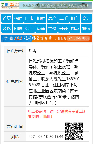 伟雅新材招装卸工(装卸铝导体、装炉)能上夜班、熟练绞丝工、熟练拔丝工、倒轴工;联系人魏先生18630167028地址:延白村南小河庄北工业园区东南角(南环宾馆/宁联西行500米,路南即到园区北门) 【电话咨询时,请一定说明在宁晋123看到的,谢谢!】 |