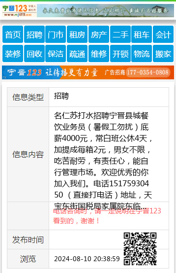 名仁苏打水招聘宁晋县城餐饮业务员(暑假工勿扰)底薪4000元,常白班公休4天,加提成每箱2元,男女不限,吃苦耐劳,有责任心,能自行管理市场。欢迎优秀的你加入我们。电话15175930450 (直接打电话)地址,天宝东街国税局家属院东临