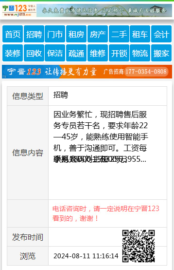 因业务繁忙,现招聘售后服务专员若干名,要求年龄22—45岁,能熟练使用智能手机,善于沟通即可。工资每个月18000—3000元。