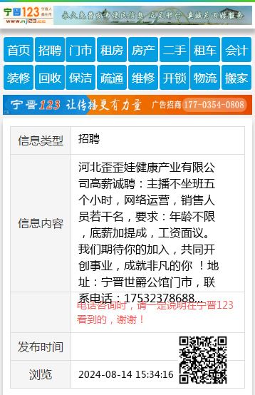 河北歪歪娃健康产业有限公司高薪诚聘:主播不坐班五个小时,网络运营,销售人员若干名,要求:年龄不限,底薪加提成,工资面议。我们期待你的加入,共同开创事业,成就非凡的你 !地址:宁晋世爵公馆门市,联系电话:17532378688 【电话咨询时,请一定说明在宁晋123看到的,谢谢!】 |