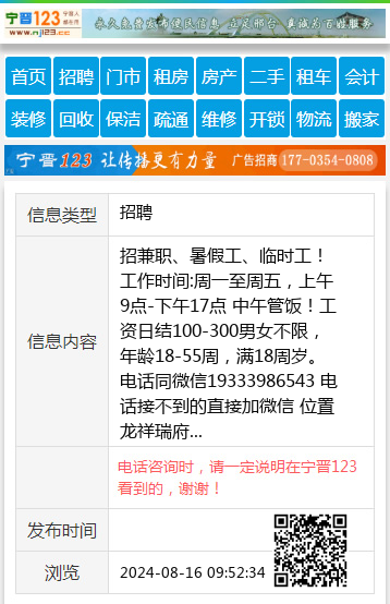 招兼职、暑假工、临时工!工作时间:周一至周五,上午9点-下午17点 中午管饭!工资日结100-300男女不限,年龄18-55周,满18周岁。电话同微信19333986543 电话接不到的直接加微信 位置龙祥瑞府