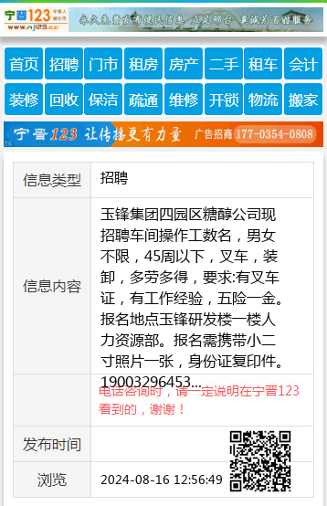 玉锋集团四园区糖醇公司现招聘车间操作工数名,男女不限,45周以下,叉车,装卸,多劳多得,要求:有叉车证,有工作经验,五险一金。报名地点玉锋研发楼一楼人力资源部。报名需携带小二寸照片一张,身份证复印件。19003296453 【电话咨询时,请一定说明在宁晋123看到的,谢谢!】 |