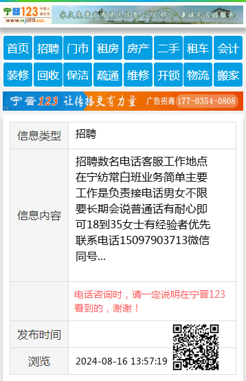 招聘数名电话客服工作地点在宁纺常白班业务简单主要工作是负责接电话男女不限要长期会说普通话有耐心即可18到35女士有经验者优先联系电话15097903713微信同号 【电话咨询时,请一定说明在宁晋123看到的,谢谢!】 |