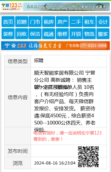 顺天智能家居有限公司 宁晋分公司 高新诚聘: 销售主管一名工资面议 ❶办公室内勤接单人员 10名,(有无经验均可)负责向客户介绍产品、每天微信群发报价、安排发货。 薪资待遇:保底4500元,综合薪资4500--10000公休四天、养老保险、团建和各项奖励等。 工作时间:8:30-12:00 2:00--6:30 ❷售后客服5名,女士优先,25到45岁,薪资3500--6000 元, 月公休4天,入养老保险, 工作时间:8:30-12:00 2:00-6:30 ❸电话客服(无销售性质),每天工作6小时,时间自由,月休4天,薪资3000--5000 🏠地址1:西环路韩沐汗蒸对过 🏠 地址2:童泰大楼红绿灯南行300米路西 ☎️联系:韩经理17692672326(微信同号) |