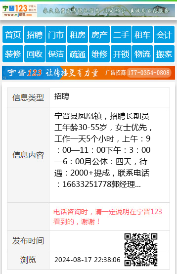 宁晋县凤凰镇,招聘长期员工年龄30-55岁,女士优先,工作一天5个小时,上午:9:00—11:00下午:3:00—6:00月公休:四天,待遇:2000+提成,联系电话:16633251778郭经理 【电话咨询时,请一定说明在宁晋123看到的,谢谢!】 |