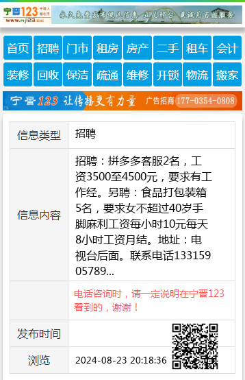 招聘:拼多多客服2名,工资3500至4500元,要求有工作经。另聘:食品打包装箱5名,要求女不超过40岁手脚麻利工资每小时10元每天8小时工资月结。地址:电视台后面。联系电话13315905789