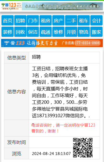 工资日结,招聘夜班女主播3名,会用缝纫机优先,免费培训,带保底,工资日结,每天直播两个多小时,时间自由,工作环境好,每天工资200,300,500…多劳多得地址宁晋县凤城国际电话18713991027微信同步。 【电话咨询时,请一定说明在宁晋123看到的,谢谢!】 |