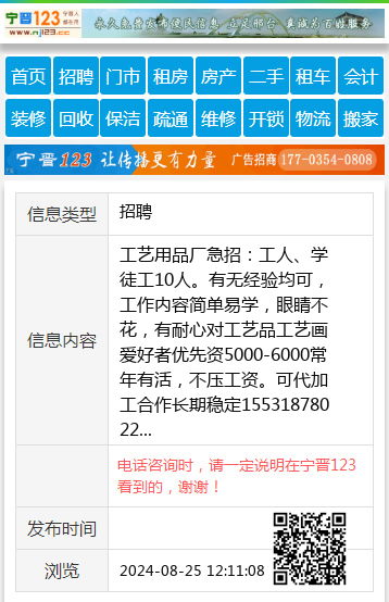 工艺用品厂急招:工人、学徒工10人。有无经验均可,工作内容简单易学,眼睛不花,有耐心对工艺品工艺画爱好者优先资5000-6000常年有活,不压工资。可代加工合作长期稳定15531878022 【电话咨询时,请一定说明在宁晋123看到的,谢谢!】 |