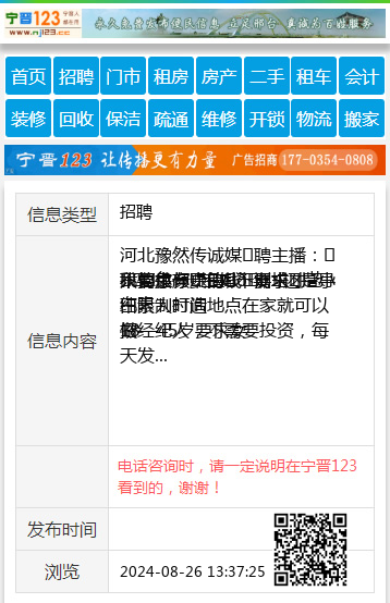 | 防骗提醒: | 宁晋123(www.nj123.cc)提醒您:手工活、网络兼职、刷单,都是骗子!凡以各种名义收取费用的都是骗子!找工作是往兜里挣钱,让你往外掏钱的都是骗子!异地招聘请提高警惕,谨防诈骗! |