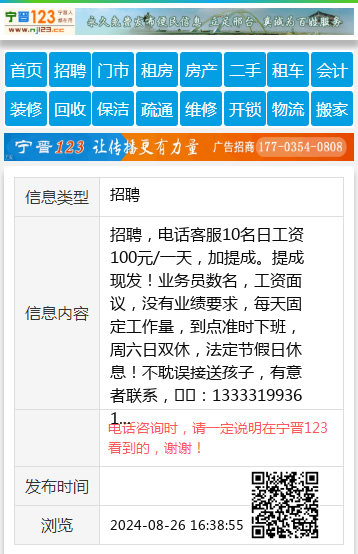 招聘,电话客服10名日工资100元/一天,加提成。提成现发!业务员数名,工资面议,没有业绩要求,每天固定工作量,到点准时下班,周六日双休,法定节假日休息!不耽误接送孩子,有意者联系,☎️:13333199361 【电话咨询时,请一定说明在宁晋123看到的,谢谢!】 |